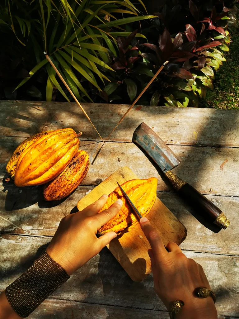 With us, a special ingredient that over the past six years we have learned to appreciate and use during Cacao Ceremonies in Bali: Theobroma Cacao—the cacao plant, the mother of chocolate.